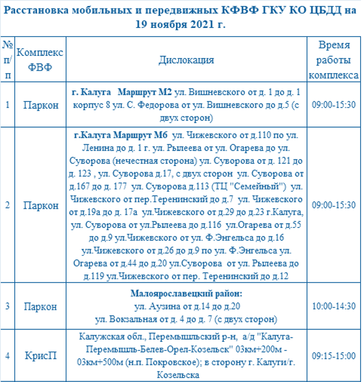 4 года назадВ пятницу, 19 ноября, в Калуге и области будут работать мобильные и передвижные комплексы видеофиксации. Некоторые из них заработают в 7:45 утра.