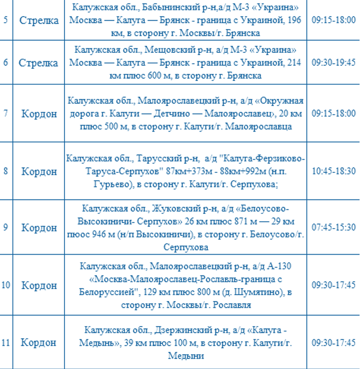 Подробная расстановка камер в Калуге и Калужской области приведена в таблице: