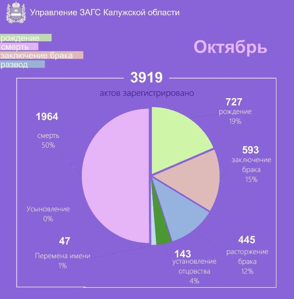 4 года назадУправление ЗАГС Калужской области опубликовало результаты своей работы за октябрь 2021 года. Всего за тот месяц в данном учреждении зарегистрировали 3919 актов гражданского состояния. Из них 727 рождений и 1964 смерти. таким образом, смертей было зарегистрировано в 2,7 раза больше.